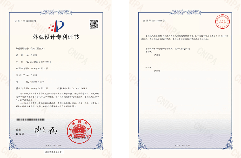 柔金能量瓷磚專利證書